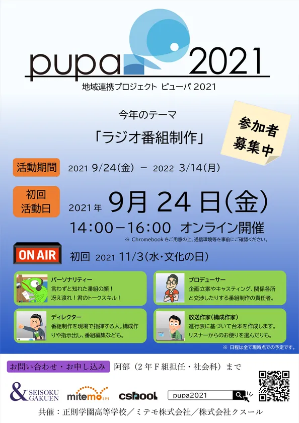 立案当初から、pupaは決して単発では終わらせず、毎年継続的に活動してゆくことを念頭に置いてきました。とはいえ、必ずしも毎年同じ活動を繰り返す必要はないのも事実です。実際、初年度はかなりリアルな「起業体験」、昨年度は「映画製作」と「生配信」、そして今年度は「ラジオ番組制作」と、ここ3年間の活動内容は年度によって全く異なっています。