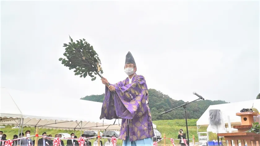 完成セレモニーの前に地元宮司の槙岡 一彌氏により、両社社員で地鎮祭を開催。