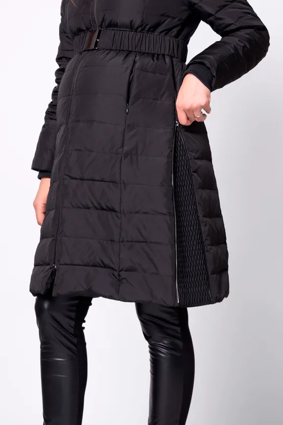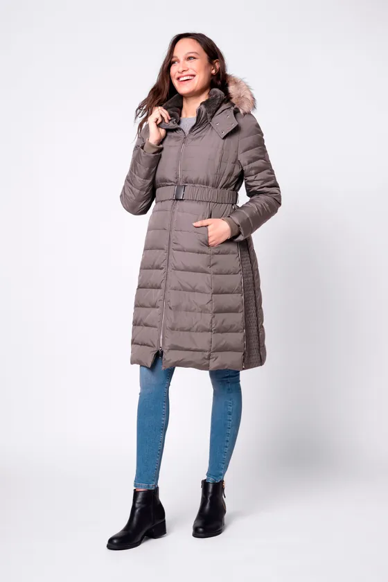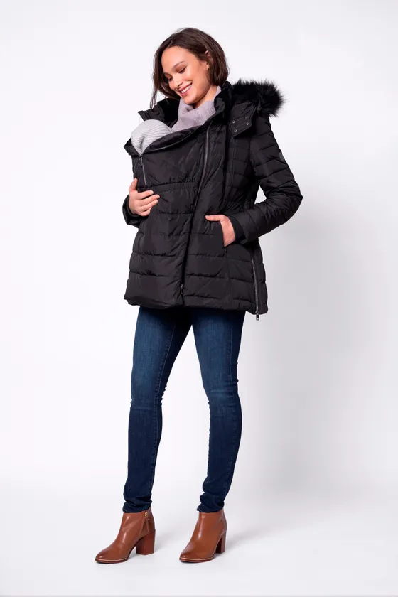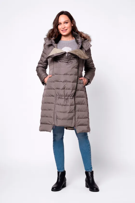 デザインは、お尻下くらいの丈のショートタイプと、ひざまであるロングの2タイプ。ダウンコートながら着ぶくれしないスッキリしたシルエットで、サイドにあるファスナーを開閉することで身幅を調整することができます。どちらもフロントファスナーに別パーツを取り付けることであかちゃんを抱っこしたまま着用することができます。内側はボアがついておりとても暖かく、真冬のお出かけも安心です。