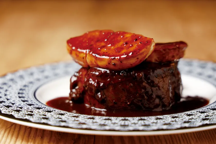 たっぷりのトリュフを入れたペリグーソースと、贅沢にフォアグラ50gを乗せた、俺のフレンチ定番の大満足のボリュームです。