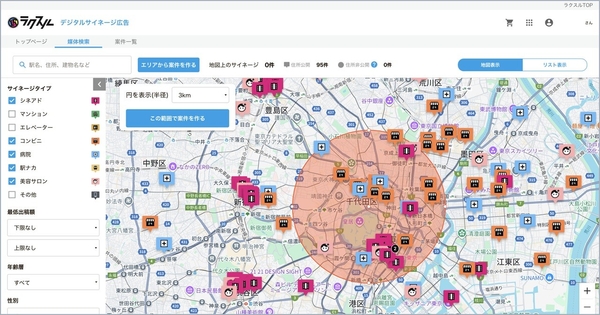 ラクスルサイネージプラットフォームは、全国にあるサイネージの情報を地図上にマッピングし、広告主の方々に様々なサイネージを一括で比較検討・発注いただけるプラットフォームです。