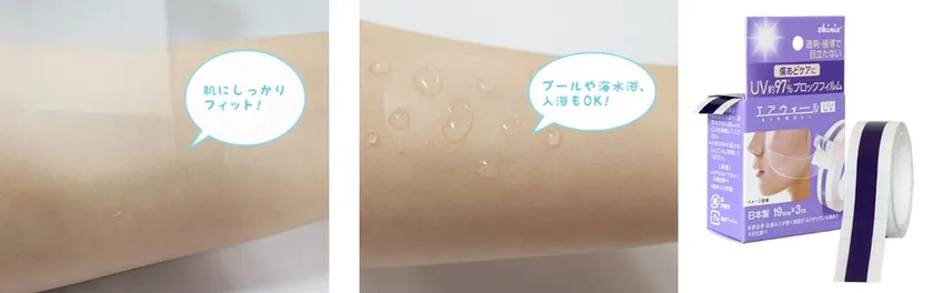 そこでskinixが開発したのが、紫外線を約97%もカットする極薄テープ「エアウォールUV」。卵の薄皮の10分の1の薄さ、わずか約7μmの高伸縮フィルムが肌によくなじみ、まるで貼っていないかのような貼りごこちなのに、紫外線を約97%もカットします。防水だから汗やプールなどの水場でもはがれにくく、夏の強い紫外線や刺激から傷あとをしっかり守ります。