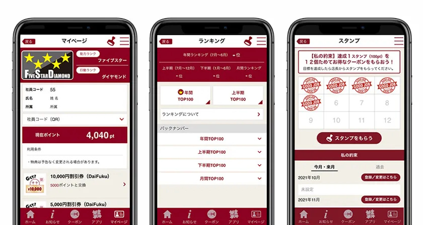 アプリ内では、パート/アルバイトと社員の2種類に分類され、それぞれ利用可能な機能が異なります。多くの機能はパート/アルバイト向けに用意されており、評価軸となる能力ランク/行動ランクや会社への貢献度に応じて付与されるポイント制度、毎月提出する業務目標の達成に応じたスタンプ機能などがあります。スタンプ1個につき100ptが付与され、スタンプが12個集まると達成クーポンが自動的に付与される仕組みとなっています。年間/上半期/下半期/月間の4種類の期間内に獲得したポイント数のランキングも表示されます。