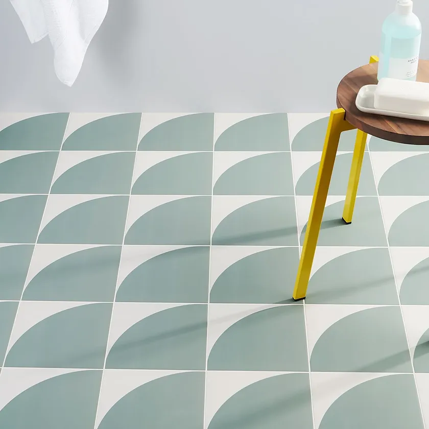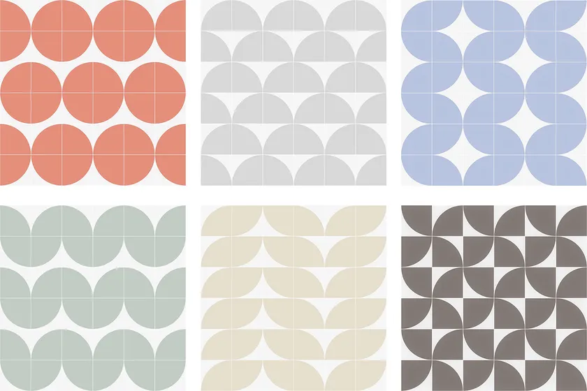 虹の延長線上にあるかのような鮮やかな色合いと円弧模様が特徴の200角タイル。曲線が描く模様は向きや組み合わせによりその表情を変え、どこかレトロな雰囲気をまとったリズミカルな空間を演出します。ミッドセンチュリースタイルにぴったり。