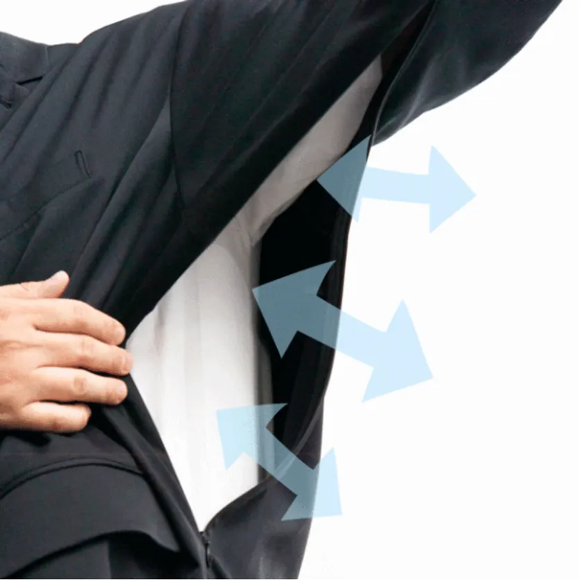 A. ジャケットの脇下に隠しファスナーがあり、暑い時に開ければ空気の入れ替えができて、涼しく快適。