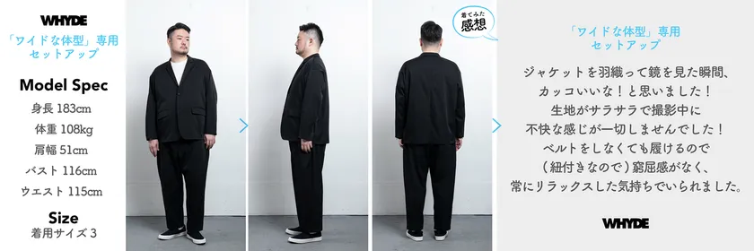 世の中にこれほど洋服があるのに、なぜワイドな体型の男性が魅力的に着られる洋服ってないんだろう……!「WHYDE」はそんな疑問(WHY)から生まれた、ワイド(WIDE)な体型の男性専用のブランドです。ワイドな男性のためだけのデザインと技術をデザイナー、パタンナー、縫製工場と何度も試行錯誤して詰め込みました。今までの、妥協しながら「着られる服」とは全く違う、ワイドな男性が着るからこそ「魅力が惹き立つセットアップ」をお届けします。