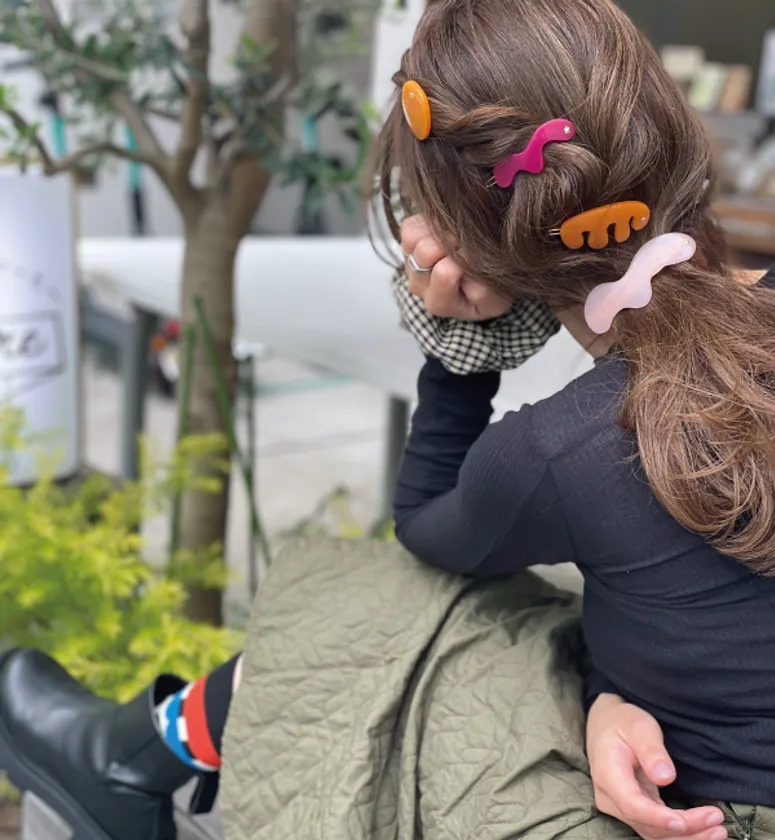 ファッションをモードでキメたら髪はルーズに緩やかなまとめ髪に仕上げて、ポイントにカラーを取り入れると「今風」の仕上がりに。マティスのカラー、デザインはユニークなので、後ろ姿がとても印象的に映えます。どの位置にも自由につけられるので、着ける位置によって印象が違って見えます。髪もファッションの一部、バッグや靴のように時にはヘアアクセサリーにもスポットあててみては?