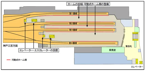 また、新1番線の供用開始に併せて、ホームからの転落事故等の防止策として、国、大阪府及び大阪市の補助を得て整備している新1番線ホームの可動式ホーム柵も供用を開始します。