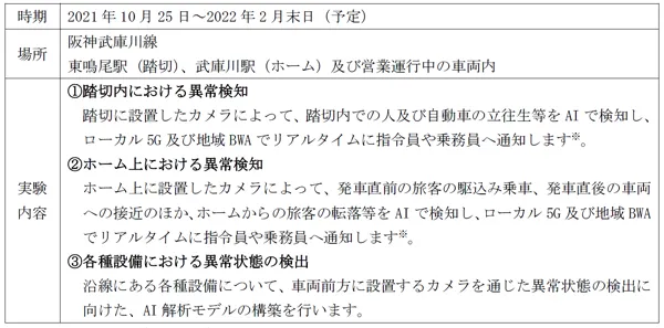 阪急阪神ホールディングスグループでは、DXの一環としてAI、5G等の先端技術を活用した取組みを推進しています。今回、阪神電気鉄道株式会社(本社:大阪市福島区、社長:秦雅夫)、アイテック阪急阪神株式会社(本社:大阪市福島区、社長:清水正明)、株式会社ベイ・コミュニケーションズ(本社:大阪市福島区、社長:竹間郁夫)及び阪神ケーブルエンジニアリング株式会社(本社:兵庫県西宮市、社長:藤井啓詳)は、踏切・ホーム等の更なる安全性の向上及び設備点検業務の省力化の実現を目指し、阪神武庫川線において画像解析AI、ローカル5G、地域BWAを活用した実証実験を2021年10月25日から開始します。