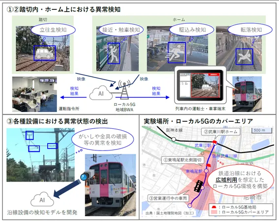 本実証実験では、踏切・ホーム等における更なる安全性の向上及び巡視点検業務の省力化を図ることを目的に、画像解析AIとローカル5Gによる異常検知等の実用可能性を検証します。併せて、カメラ映像やAI解析結果を伝送する通信基盤として、ローカル5Gに加えて既存の地域BWAで比較検討を行い、より最適な通信方式を検証します。なお、ローカル5Gは実験試験局として武庫川線沿線を広くカバーすることで、将来の鉄道環境における広域利用を見据えた検証を行います。