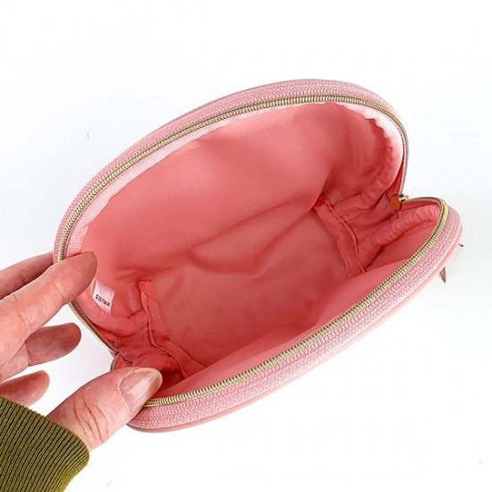 内側もピンクの布地になっています。ラウンドポーチはサイドまでファスナーが開くので、中身の出し入れのしやすさも格別ですよ。