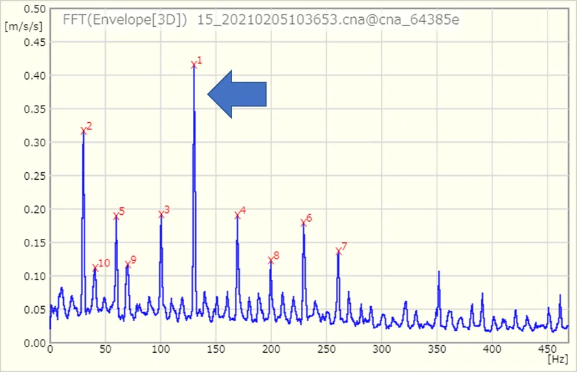 さらに、3軸の振動波形それぞれのエンベロープ波形を合成してからFFTによる周波数分析を行うことで、より感度が高くノイズの少ない検知が可能になりました。