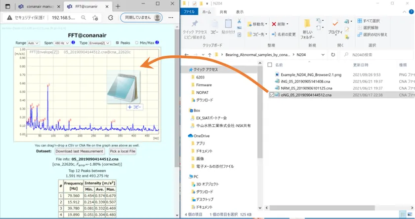 今回、コナンエアーでは1kHz程度までの低い周波数帯域ですが、3軸方向の振動データが同時計測・データ保存できることを利用して、これまでの高性能振動センサーによる精密診断と同等のことが出来ることを確認しました。