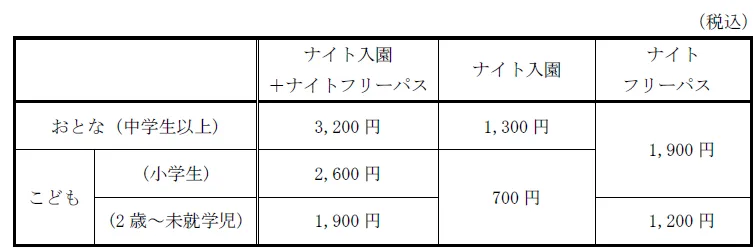 ※「ナイトフリーパス」は園内インフォメーションでも販売いたします。