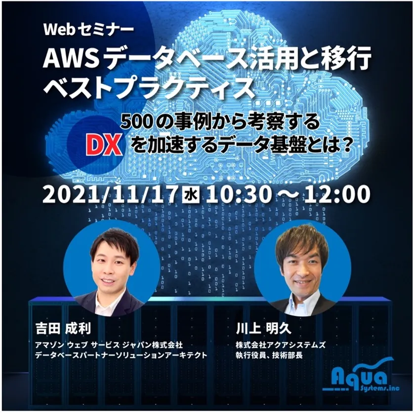 データベースに特化した業界トップレベルのエンジニア集団として、高度なデータベース案件の課題解決を支援する株式会社アクアシステムズ(本社:東京都中央区、代表取締役社長:赤間 保、以下 アクアシステムズ)は、無料ウェブセミナー「AWSデータベース活用と移行ベストプラクティス -500の事例から考察するDXを加速するデータ基盤とは?-」を2021年11月17日(水)に開催します。