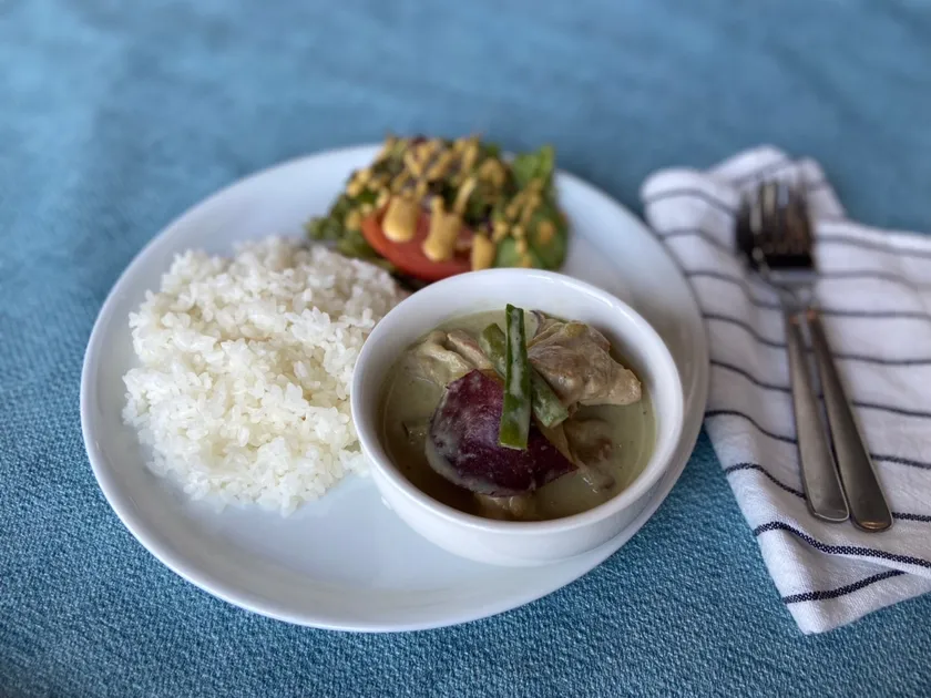 隣接のカフェでは、@FARM産のさつまいもを使った『おいもメニュー』を販売中です。さつまいもがゴロッと入った本格的なグリーンカレーや、まるごと焼いもにバニラアイスをのせたスイーツが大人気です。さつまいも掘り体験の後に、ゆっくりお食事をお楽しみいただけます。