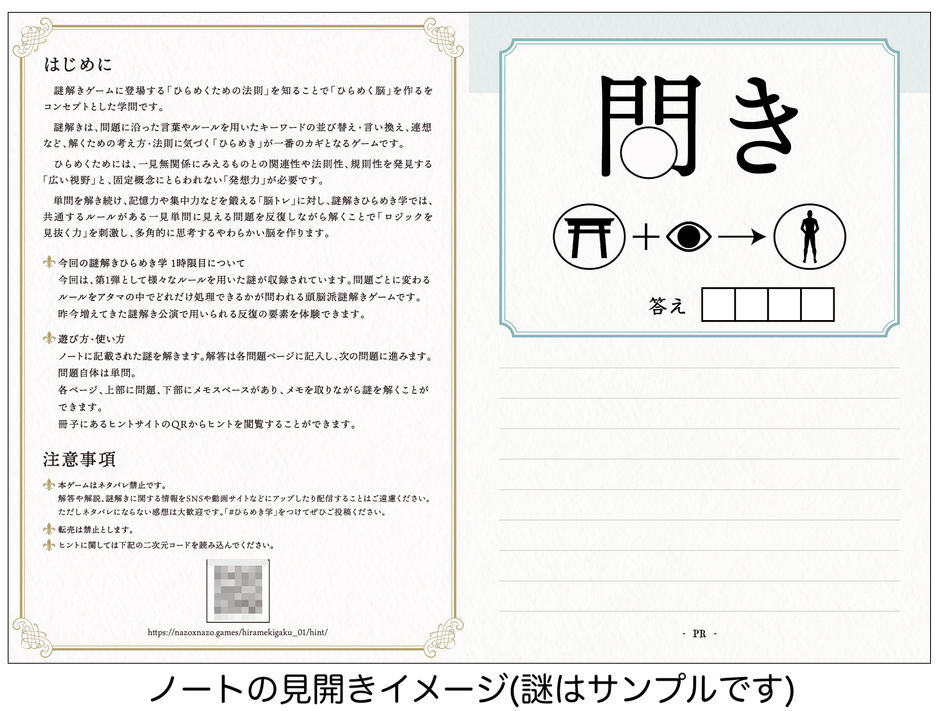 「ひらめき」を新しい学問としたコンセプトとした学習教材のようなデザインと、昨今増えてきた公演型の謎解きゲームで用いられる反復(前に解いた問題のルールの応用)の要素が多く盛り込まれた内容が最大の特徴です。ゲームを進行するにつれ、謎のルールの応用力・発想力が問われ、思考が複雑化していきます。「ひらめき」を鍛え、謎解き力を上げたい謎解きファンの方の自主勉強や、頭脳ゲーム・論理ゲームが好きな方、アタマを柔らかくしたい大人をはじめとする幅広い層におすすめです。