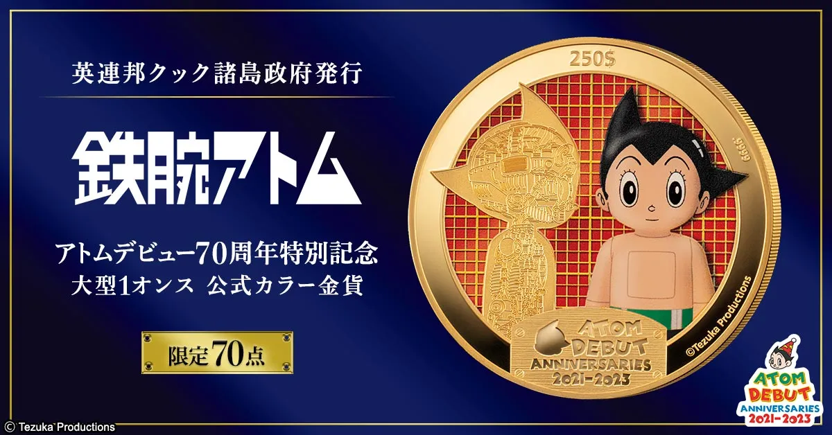 アトムが日本の漫画史に初めて登場したのは、1951年の「アトム大使」にて。その後、「鉄腕アトム」でお茶の間のヒーローとなったアトム。その輝かしきデビュー70周年を記念して、コイン史に残る大型金貨が特別発行されました。