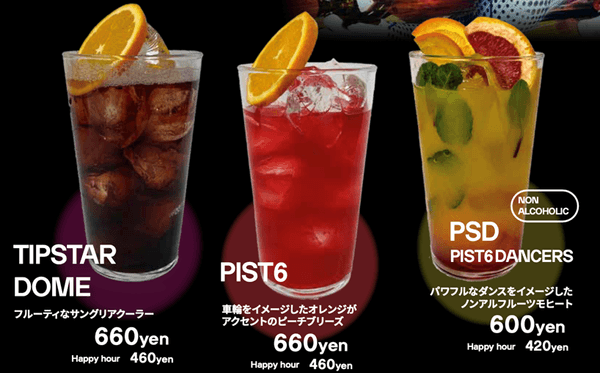 また、より楽しくレースを観戦して頂く為にHUB×PIST6のコラボドリンクも本イベントの為に開発いたしました。バンクを駆け抜ける自転車をイメージしたフルーティーなサングリアクーラーの「TIPSTAR DOME」(税込¥660、Happy hour ¥460)、PIST6カラーで爽やかなピーチブリーズの「PIST6」(税込¥660、Happy hour ¥460)、PSDのエネルギッシュなダンスからインスピレーションを得た、ノンアルコールのフルーツモヒートの「PSD」(税込¥600、Happy hour ¥420)の3種類をご用意しました。毎回熱いレースを繰り広げている「PIST6 Championship」セカンドシーズン「ZERO」と合わせて、本イベントにもぜひご注目ください。