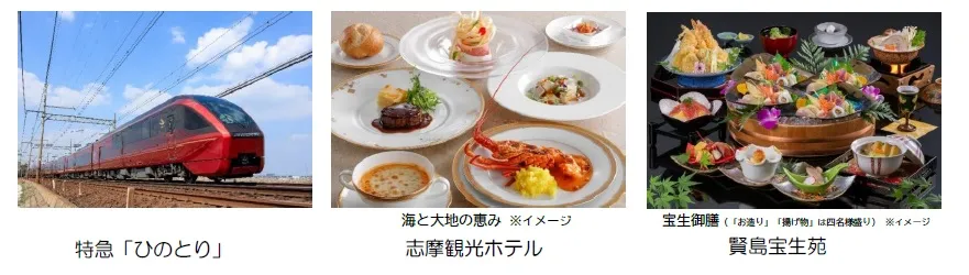 また、名古屋から初めて志摩の賢島駅へは12月1日(水)出発の「ひのとり」でプレミアムシートをご利用いただき志摩観光ホテルでランチ、またはレギュラーシートをご利用いただき賢島宝生苑でランチしていただくプランで、ともにツアー特典でひのとりノベルティグッズ、赤福朔日餅が付いています。