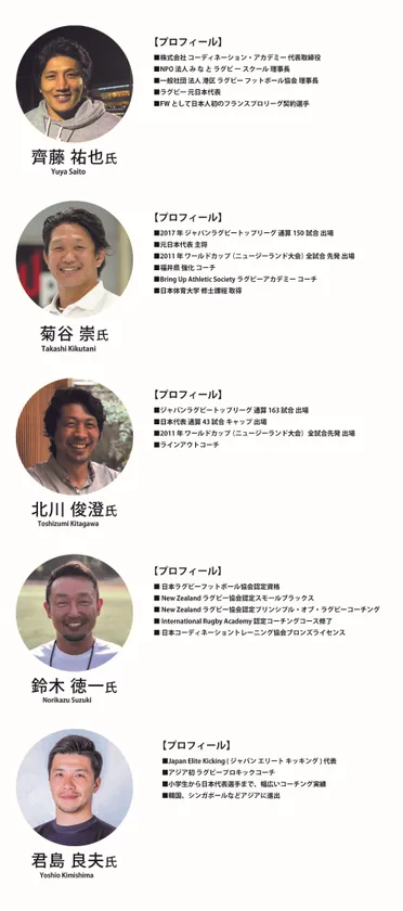 上記講師陣に加えて、ジャパンラグビーリーグワン所属チームの東芝ブレイブルーパス東京・東京サントリーサンゴリアス(11月14日)、リコーブラックラムズ東京(11月20日)、日野レッドドルフィンズ(12月4日)の協力を得て実施いたします。