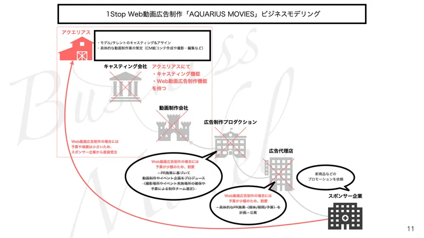 そこで、アクエリアスでは、中小・ベンチャー企業の予算規模に合わせて、スポンサー企業から直接受注し、ワンストップでWeb動画広告を制作するサービス「アクエリアスムービーズ」をスタートすることと致しました。