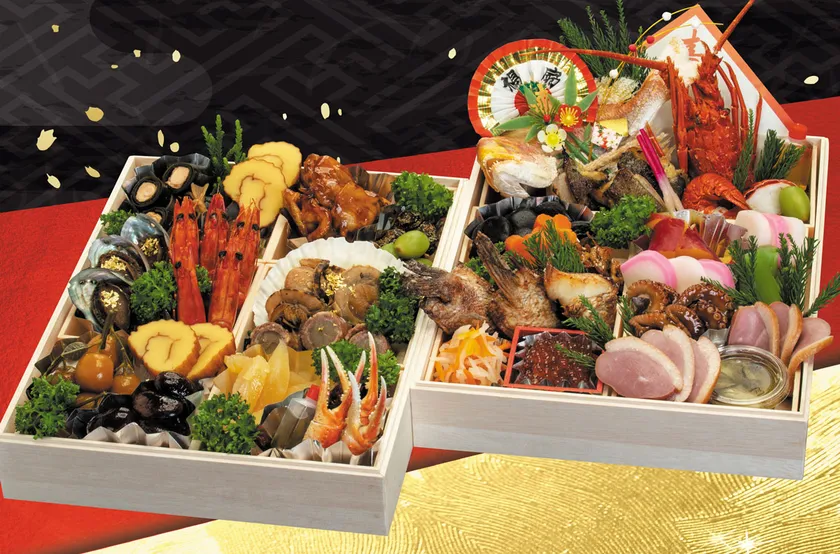 内容:ロブスター浜蒸し、牡蠣オイル漬け、昆布巻、アワビ柔らか煮、銀ダラ西京焼き、真鯛若狭揚げ、いくら醤油漬け、紅白かまぼこ、数の子、ズワイガニ、栗きんとんなど、計30品
