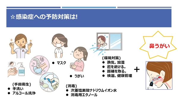 毎日「鼻うがい」を1、2回することにより、感染リスクを下げ、感染症予防につながります。また「鼻うがい」をする事により、鼻腔内を洗浄することで、防御機能である線毛運動、上咽頭を活性化し、本来の防御機能を回復することで、感染症予防につながります。