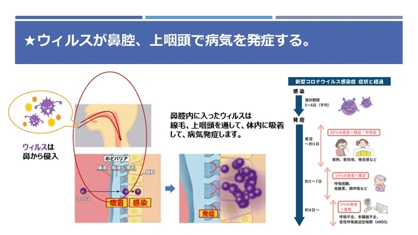 実は大事なのは、鼻のケア。ウィルス感染症の多くが、鼻腔、上咽頭の上気道から感染するといわれています。インフルエンザウィルスは侵入して潜伏期間は1~2日、感染、発症。新型コロナウィルスについては侵入してから潜伏期間は5~6日と言われております。発症する1日前くらいから周囲の人にうつしてしまう可能性があります。