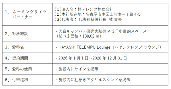 対象施設は、天白キャンパス研究実験棟Ⅳ2F多目的スペース(以下、「本施設」)で、2026年1月1日から2028年12月31日まで本施設の愛称は「HAYASHI TELEMPU Lounge」となります。