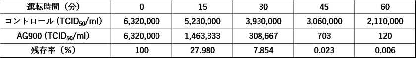 【表1 AG900による浮遊新型コロナウイルス抑制効果(感染価の低下)】