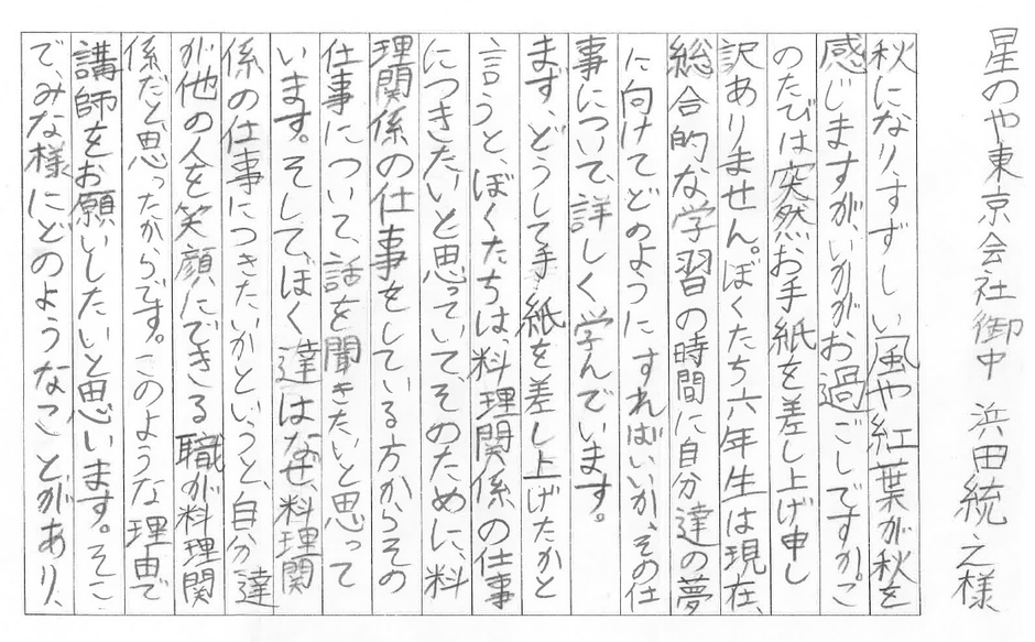 大田区立池上第二小学校では年に一度、6年生に向けて「ドリームプロジェクト」というキャリア教育を実施しています。子供たちが将来就きたい職業に携わっている様々な分野の講師を招き、直接話を聞いたり、質問をしたりすることで、その仕事の楽しさや難しさ、やりがいなどを知り、理解を深めます。今回、料理人の仕事に興味を持っている6年生の児童より、料理長・浜田に宛てて、講師を依頼する直筆の手紙が送られてきたことがきっかけで、初めて参加しました。