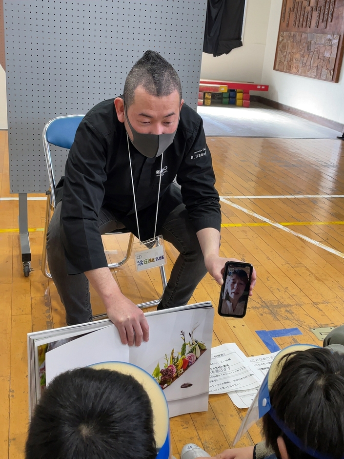 浜田は、料理人を目指している子供たちに、料理人になるきっかけとなった小学校の家庭科でのエピソードや、料理に対する思いを中心に話しました。また、長野県軽井沢町でトマトやレタスなどの無農薬野菜を栽培している「軽井沢サラダふぁーむ」の生産者・依田美和子氏にもオンラインで参加してもらい、浜田と共に食材の大切さや、生産者と料理人の関係について、子供たちに向けて話していただきました。