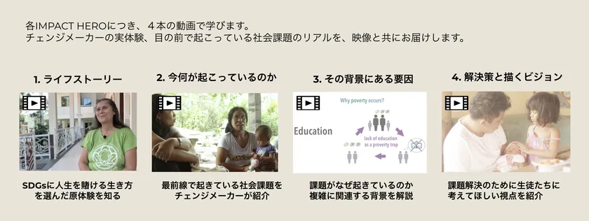 Earth Companyが支援する、国際的に活躍し高く評価される、アジア太平洋地域のチェンジメーカーが教材制作に全面協力。最前線で課題解決に取り組む彼らが、人の人生に深く関わるSDGsを「圧倒的リアル」に伝えます。彼らの物語をベースにした動画教材で、頭と心で、社会課題の構造的・根本的な理解を深めていきます。
