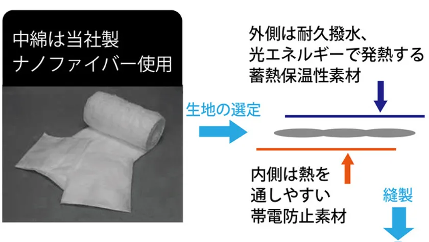 中綿に当社で製作している超極細繊維ナノファイバーを使用しており、体から出る熱エネルギーを、髪の毛の直径1/100の超極薄繊維でナノレベルの空気層に閉じ込めます。生地も外側は耐久撥水、光エネルギーで蓄熱保温素材、内側は熱を通しやすい帯電防止素材です。