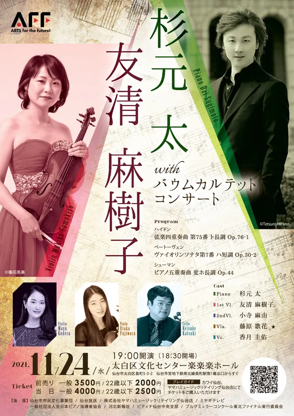 株式会社S.A.musicking(本社:仙台市青葉区、代表取締役:武内園子)は、「杉元太・友清麻樹子 with バウムカルテットコンサート」を2021年11月24日(水)に太白区文化センターで開催いたします。