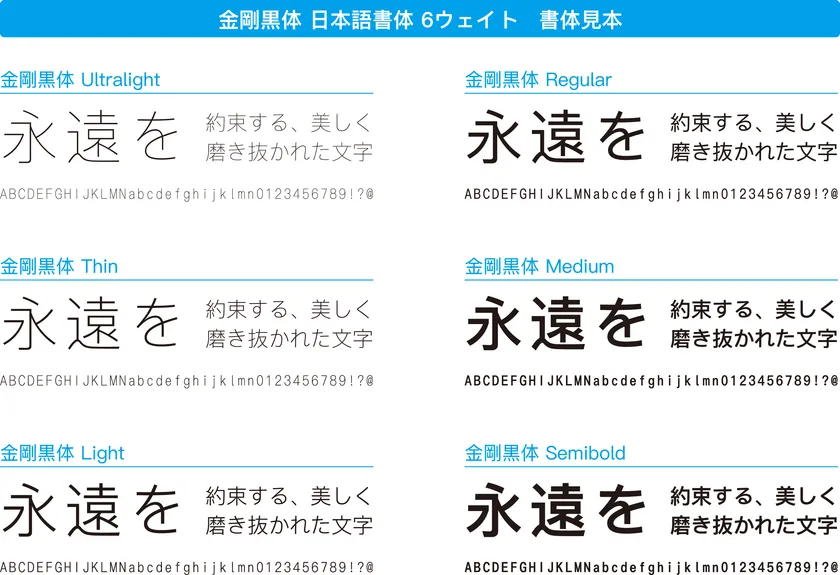 「金剛黒体」は、ダイヤモンドの王様と呼ばれるカーボネードのように光輝いた新しいスタイルのUltralight、Thin、Light、Regular、Medium、Semiboldの6ウェイトで展開するゴシック体ファミリーです。