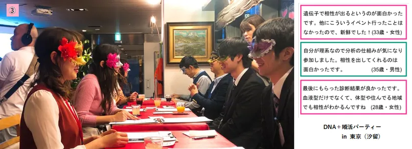 東京では、テレビ取材パーティーを含め6度目の開催となります。本パーティーは、事前に採取・分析したパーティー参加者のDNA(HLA遺伝子)情報を用いて抽出した相性結果を活用しながら、自分に合う相手を探していく婚活パーティーとして行われます。(プロフィールカードは使用しない)