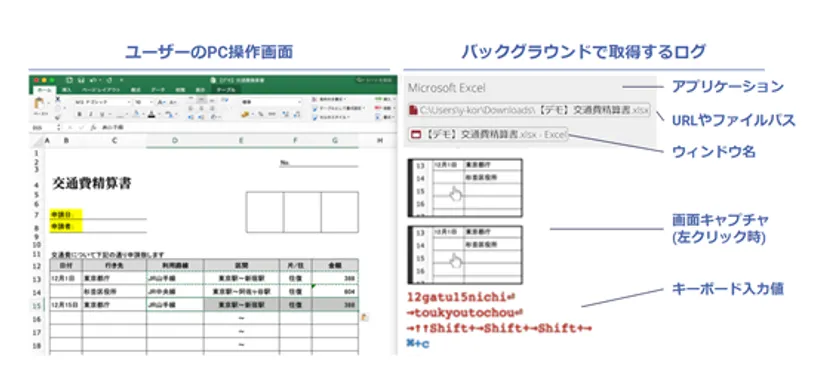 従業員のPC操作を中心としたワークログを収集し、可視化、分析をすることで、データドリブンなバックオフィスの変革を実現するソリューションです。従業員がアクセスしたURL、使用したファイルやフォルダのパス、アプリケーション名、ウィンドウ名、左クリック時の画面キャプチャ等のPC操作ログを分析に活用できます。