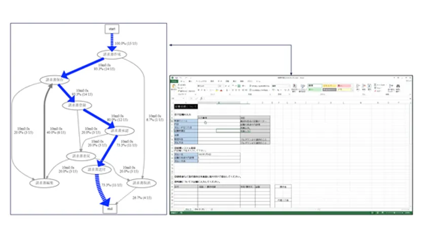 処理時間や、処理件数に加えて、処理プロセスも測定することが可能です。案件番号をキーとしているため、例えば、Aさんが申請をして、Bさんが承認するといったような、複数人が関わる業務についても分析いただくことができるようになりました。そのため、処理時間の長い案件の傾向把握や、処理における非効率な工程を特定するなど、多面的な分析が可能です。