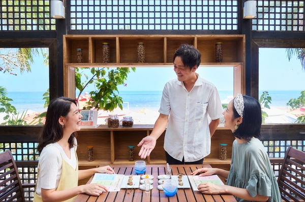 青く透き通る海と白砂のビーチのコントラストが美しい、ホテルに隣接するビーチに、海辺のカウンターを設置します。海辺のカウンターでは、小浜島の黒糖を愛する「黒糖マイスター」がその魅力や特徴を語り、その年に製糖されたばかりの黒糖を振る舞います。