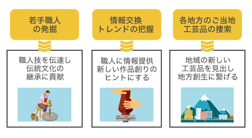 匠ワンストップでは、3D・ARビューを活用した陶磁器ECサイトを導入し、テクノロジーを活用してオンラインでも購入しやすいシステムを構築しました。また、陶磁器と顧客をマッチングさせるネットワークを構築して流通量を増やします。さらに、イベント開催や営業活動などで交流の機会を創出し、新たな匠技を発掘して地方創生にも繋げています。