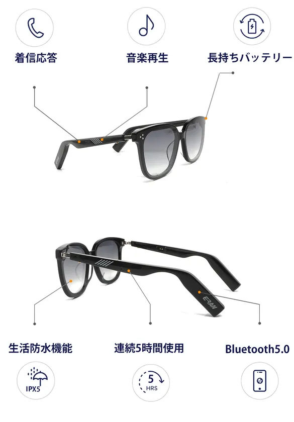 ERAN(エラン)スマートグラスは指向性スピーカーとマイクにより、耳を塞がず、周囲の音を聞きながらリスニングや通話が可能に。イヤホンを装着する手間や、落としたり紛失したりするリスクもなく、顔回りをスッキリ快適に。外出時の目の保護具やファッションアイテムとしてだけでなく、ウェアラブルデバイスとして進化!
