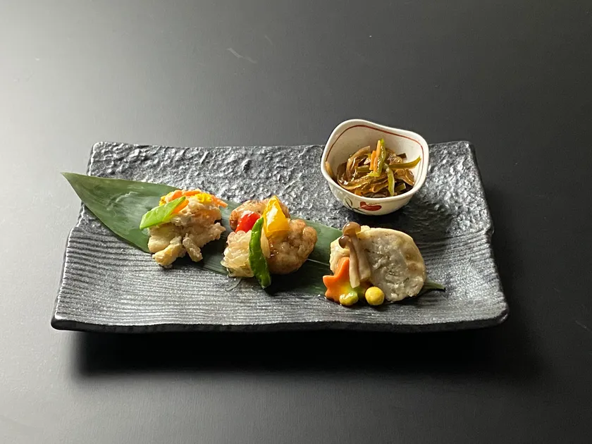 昆布締めのふぐ刺しに色とりどりの野菜を添えたヘルシーな手毬寿司。お弁当の中央には「ふぐの松前漬け」やふぐのすり身を湯葉で巻いた「ふぐの湯葉揚げ」といったふぐの新たな美味しさを味わえる惣菜もご用意しております。