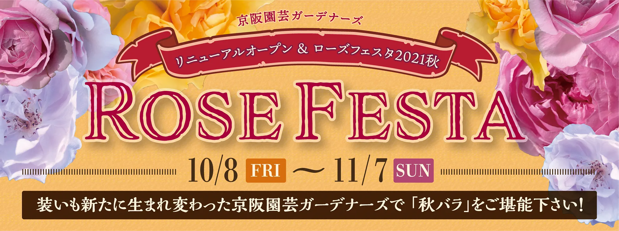 リニューアルオープンと同時開催のバラの祭典。装い新たに生まれ変わった京阪園芸ガーデナーズで思う存分秋バラをご堪能下さい。
