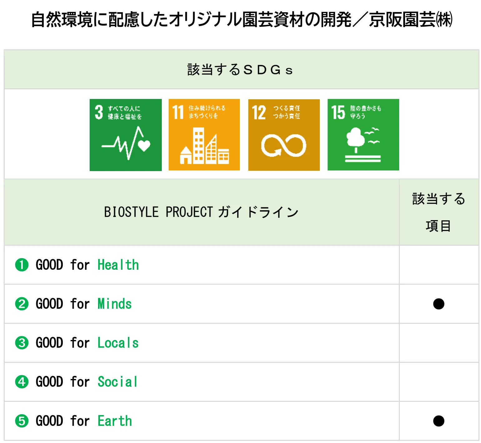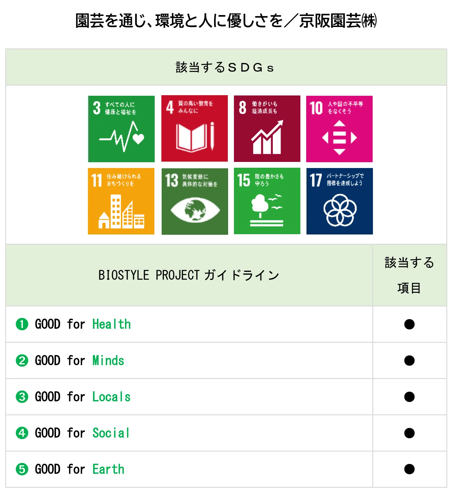 当社では2件の取り組みがBIOSTYLE PROJECTに認証されています。今後も、園芸事業を通じて、解決できる社会課題と向き合い、SDGs達成に貢献してまいります。