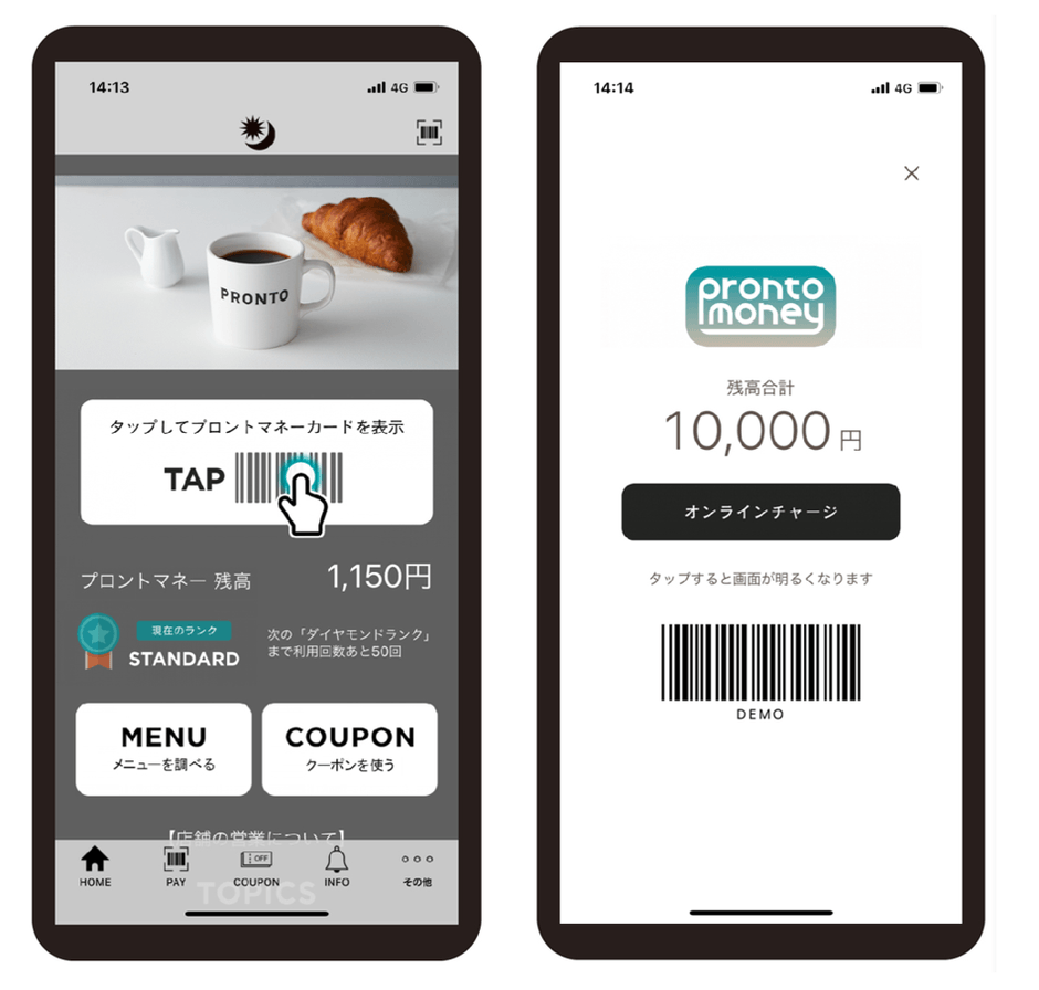 「プロントマネー」は、プロント公式アプリ内のバーコードを使ったスピーディーな決済手段です。3,000円 以上のチャージで金額の3%~7%をボーナスマネー(チャージバック)としてプレゼントする、おトクな特典付きのサービスです。また、利用回数に応じてランクアップし、ランクに応じてクーポンや特別なプレゼントをお届けするなど、「プロントマネー」はチャージするほど、使うほど特典が増える仕組みになっております。