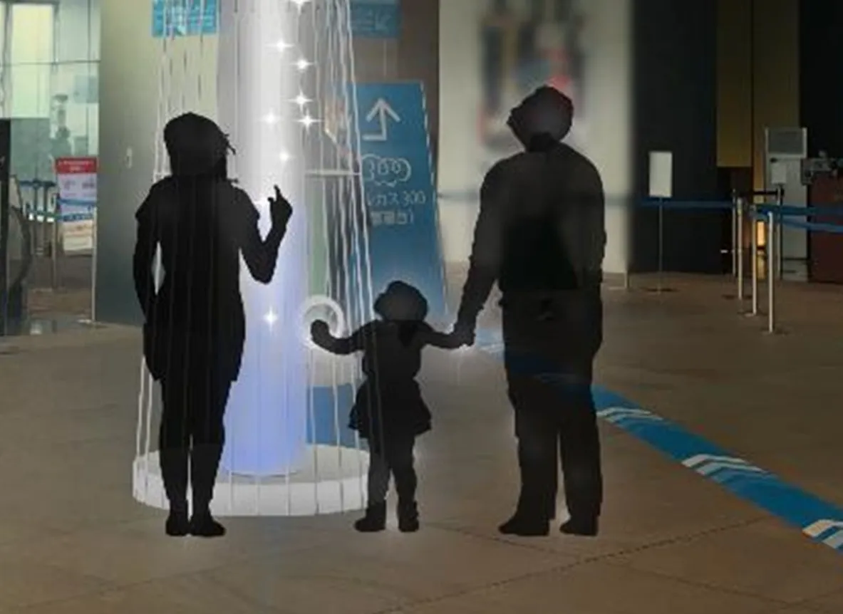 中央の高さ約10mの巨大な光の柱は、手をかざすと、お客さまの想いや願いが天空に届くように、光が下から上へと流れる体験型イルミネーションです。新型コロナウイルス感染拡大防止の観点から、非接触で光の動きをお楽しみいただけます。