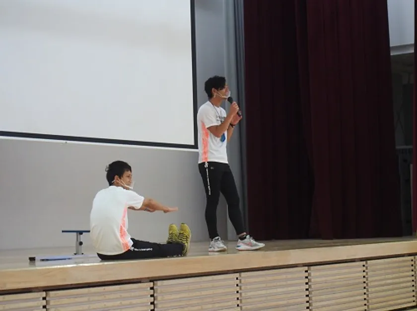 全校生徒向けに新体力テストに向けた記録アップポイントや自宅トレーニング方法、心構えなどを講義しました。