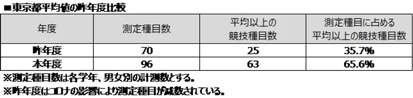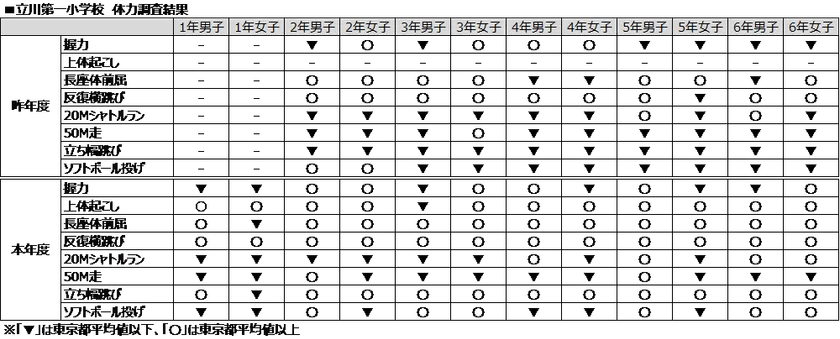 各学年男女別で競技ごとに東京都平均値と測定結果を比較し、東京都平均値以上の競技種目が約30%増加しました。「長座体前屈」「反復横跳び」「立ち幅跳び」に関しては全学年で東京都平均値以上の測定結果となりました。